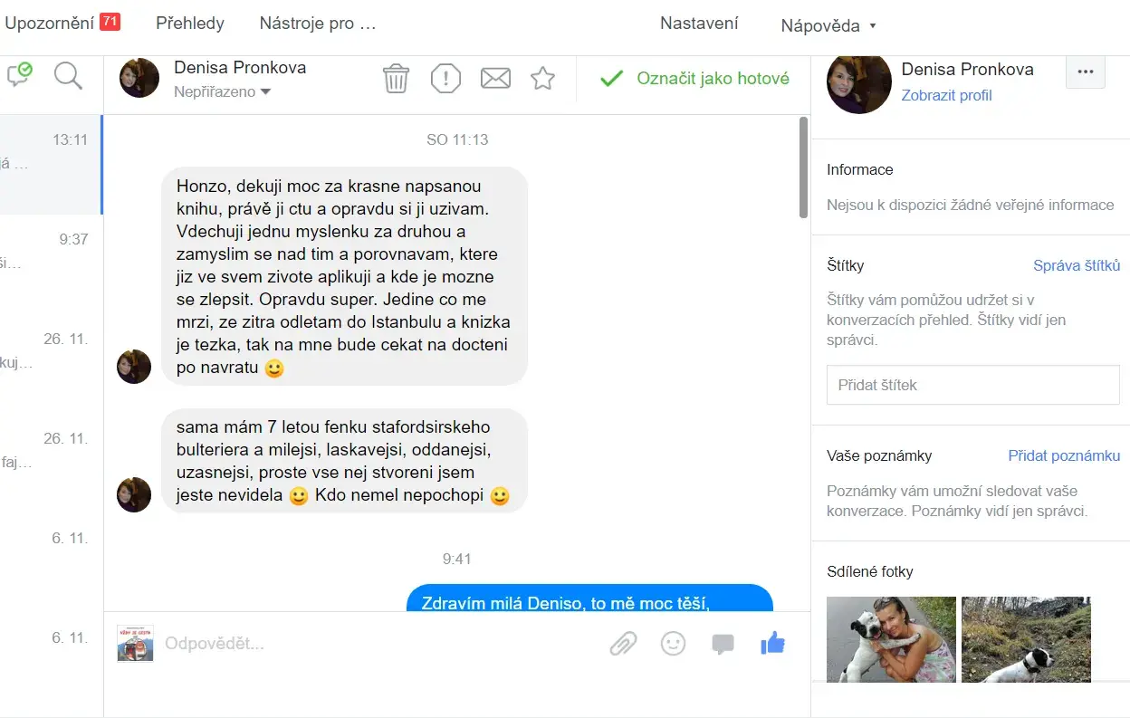 Barbara B. Vážený, milý, mému srdci od dnešního dne velmi blízký….pane Honzo. Bulím už půl hodiny, samozřejmě dojetím nad vaším příběhem, ale přiznám se, vrátil jste mi čas, kdy já sama jsem chtěla odejít z tohoto světa, ale jak Vy sám říkáte, zvířátka se neopouští…..a já toto s Vámi stoprocentně sdílím, bylo jich tenkrát 12 zachráněných kousků, takže pěkná smečka, psi i kočičky. V den mého rozhodnutí odejít, se všichni rozhodli mi to překazit, zapomněli i na šarvátky, naskákali ke mně do postele, kde bylo vše připraveno na poslední moji cestu a zoufale na mě zírali. Bylo děsivé zjistit, co bych jim provedla, vždyť jsem jim slíbila, že je nikdy, ale opravdu nikdy neopustím. Bylo neskutečné, že i Kavkazanda Sasa, která nesnesla nikoho jiného, než mě, se chovala mezi ostatními jako beránek, byl to velmi silný okamžik záchrany nás všech navzájem. Cestu jsem našla, vlastně ji hledám stále, a všechny moje chlupaté lásky mého života se měly báječně, loni mi odešla poslední fenečka ve 23 letech, a hned po týdnu jsem opět zachránila fenku buldočka, kdy pevně věřím na reinkarnaci….mám je zase všechny zpátky . Milý pane Honzo, velmi si vážím, že jste se ujal a hlavně neopustil svého nemocného pejska, byl a jste tím jeho celým VESMÍREM. Zachraňuji a pomáhám celý život hlavně týraným a nechtěným zvířatům, jsem pro spoustu lidí důvodem posměchu, ale krutost ke zvířatům, která u nás pozemšťanů nemá hranic mě velmi stále trápí, proto Vám moc přeji, z celého mého srdce mnoho zdraví, sil, štěstí a lásky…. život plný hojnosti, s minimem krutosti. S úctou Barbara Barešová. PS můj sen, domov pro hendikepovaná a stařičká nechtěná zvířata…..makám na tom …..knihy mám objednané dvě těším se