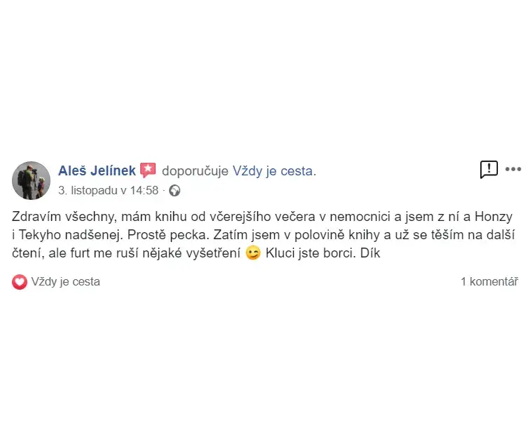 Aleš J. Zdravím všechny, mám knihu od včerejšího večera v nemocnici a jsem z ní a Honzy i Tekyho nadšenej. Prostě pecka. Zatím jsem v polovině knihy a už se těším na další čtení, ale furt me ruší nějaké vyšetření Kluci jste borci. Dík