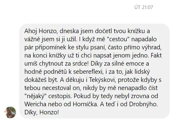 Carlo T. Ahoj Honzo, dneska jsem dočetl tvou knížku a vážně jsem si ji užil. I když mě „cestou“ napadalo pár připomínek ke stylu psaní, často přímo výhrad, na konci knížky už ti chci napsat jenom jedno. Fakt umíš chytnout za srdce! Díky za silné emoce a hodně podnětů k sebereflexi, i za to, jak lidský dokážeš být. A děkuju i Tekýskovi, protože kdyby s tebou necestoval on, nikdy by mě nenapadlo číst „nějaký“ cestopis. Pokud by tedy nebyl zrovna od Wericha nebo od Horníčka. A teď i od Drobnýho. Díky, Honzo!
