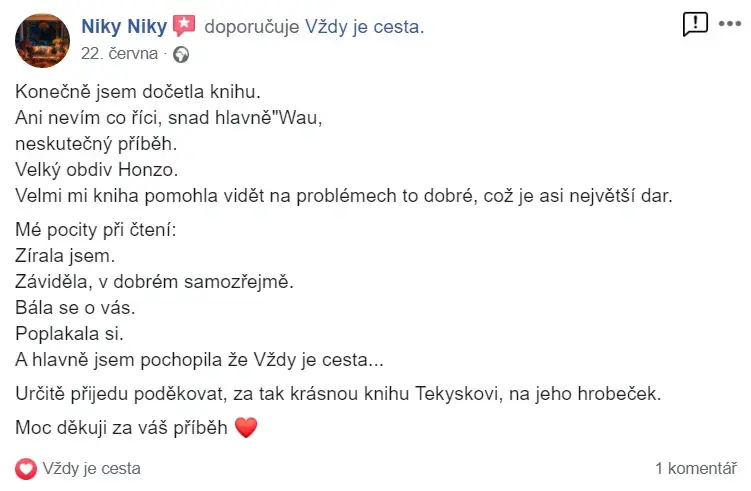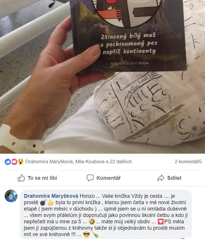 Drahomíra M. Honzo, Vaše knížka Vždy je cesta je prostě bomba. Byla to první knížka, kterou jsem četla v mé nové životní etapě (jsem měsíc v důchodu). Úplně jsem se u ní omládla duševně. Všem svým přátelům ji doporučuji jako povinnou školní četbu a kdo ji nepřečetl, má u mne za 5. Máte můj velký obdiv. PS: Měla jsem ji zapůjčenou z knihovny, takže si ji objednávám – tu prostě musím mít ve své knihovně.