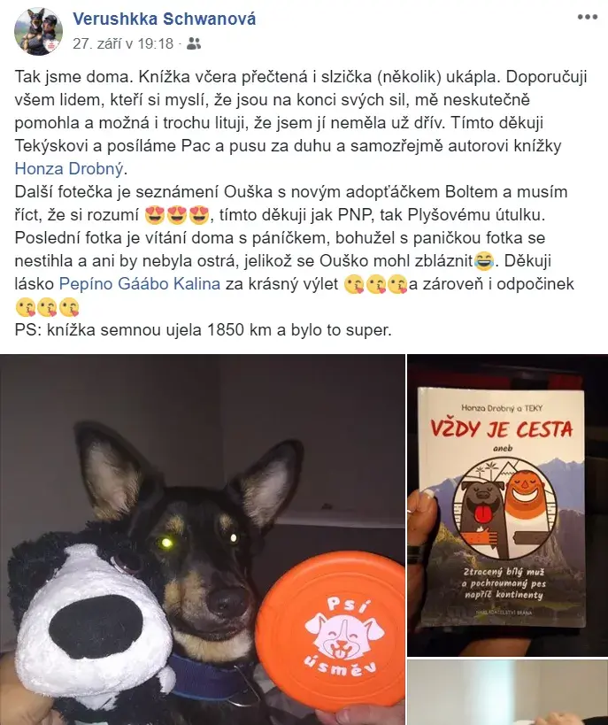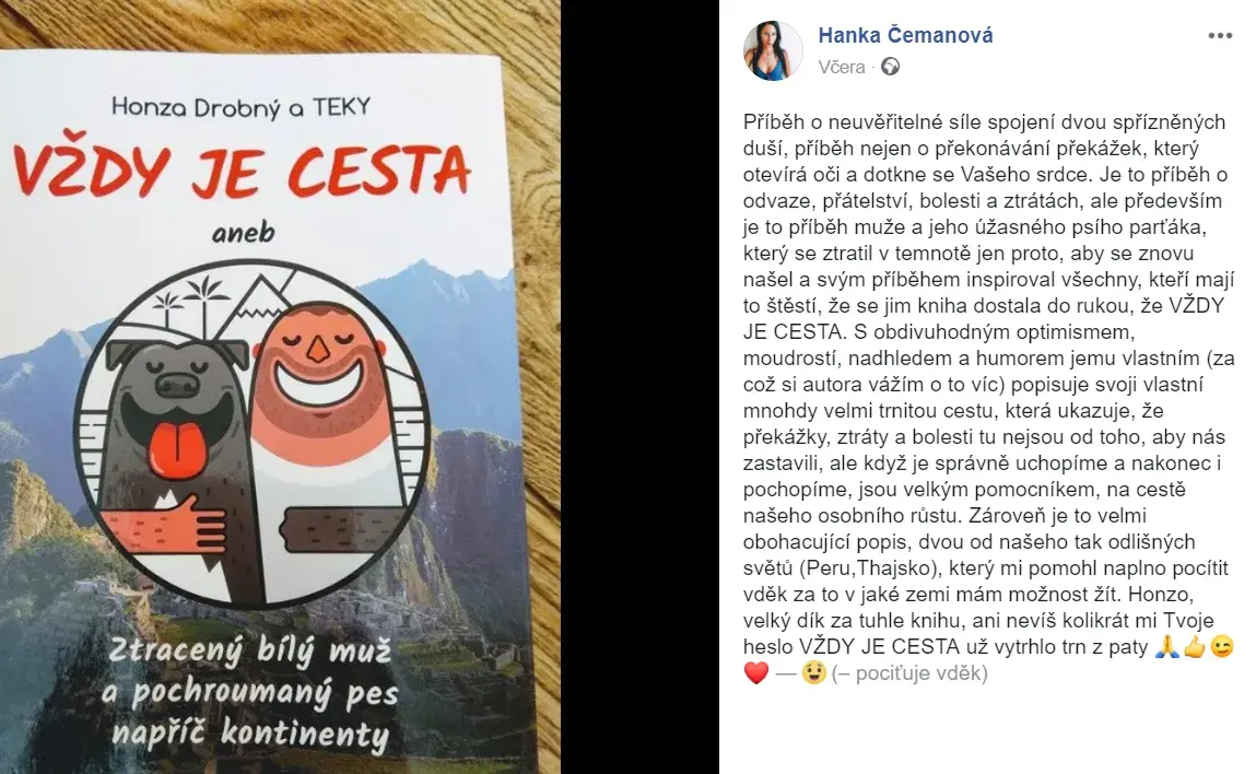 Hanka Č. Příběh o neuvěřitelné síle spojení dvou spřízněných duší, příběh nejen o překonávání překážek, který otevírá oči a dotkne se Vašeho srdce. Je to příběh o odvaze, přátelství, bolesti a ztrátách, ale především je to příběh muže a jeho úžasného psího parťáka, který se ztratil v temnotě jen proto, aby se znovu našel a svým příběhem inspiroval všechny, kteří mají to štěstí, že se jim kniha dostala do rukou, že VŽDY JE CESTA. S obdivuhodným optimismem, moudrostí, nadhledem a humorem jemu vlastním (za což si autora vážím o to víc) popisuje svoji vlastní mnohdy velmi trnitou cestu, která ukazuje, že překážky, ztráty a bolesti tu nejsou od toho, aby nás zastavili, ale když je správně uchopíme a nakonec i pochopíme, jsou velkým pomocníkem, ke změně našeho osobního růstu. Zároveň je to velmi obohacující popis, dvou od našeho tak odlišných světů (Peru, Thajsko), který mi pomohl naplno pocítit vděk za to v jaké zemi mám možnost žít. Honzo, velký dík za tuhle knihu, ani nevíš kolikrát mi Tvoje heslo VŽDY JE CESTA už vytrhlo trn z paty.
