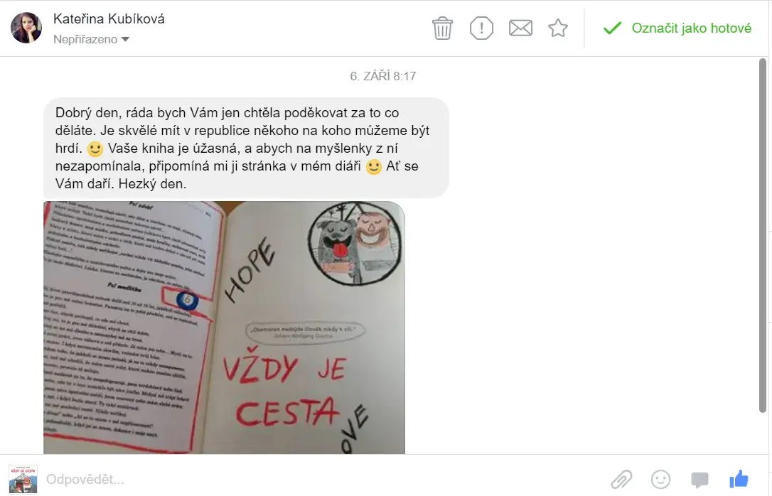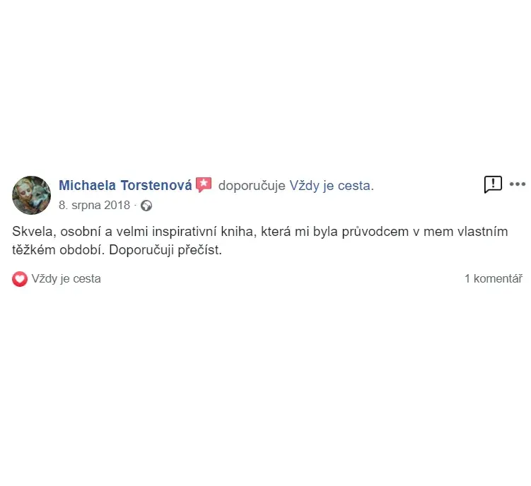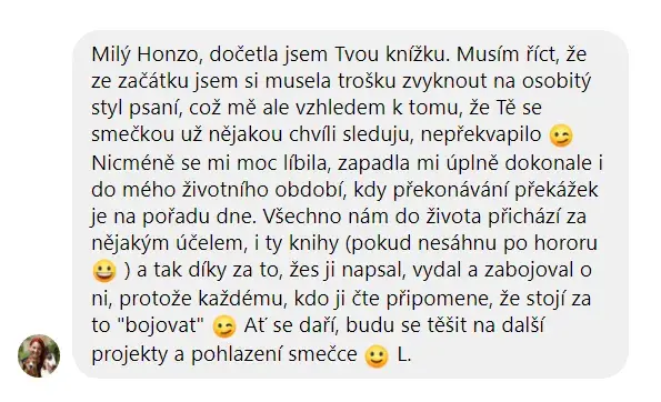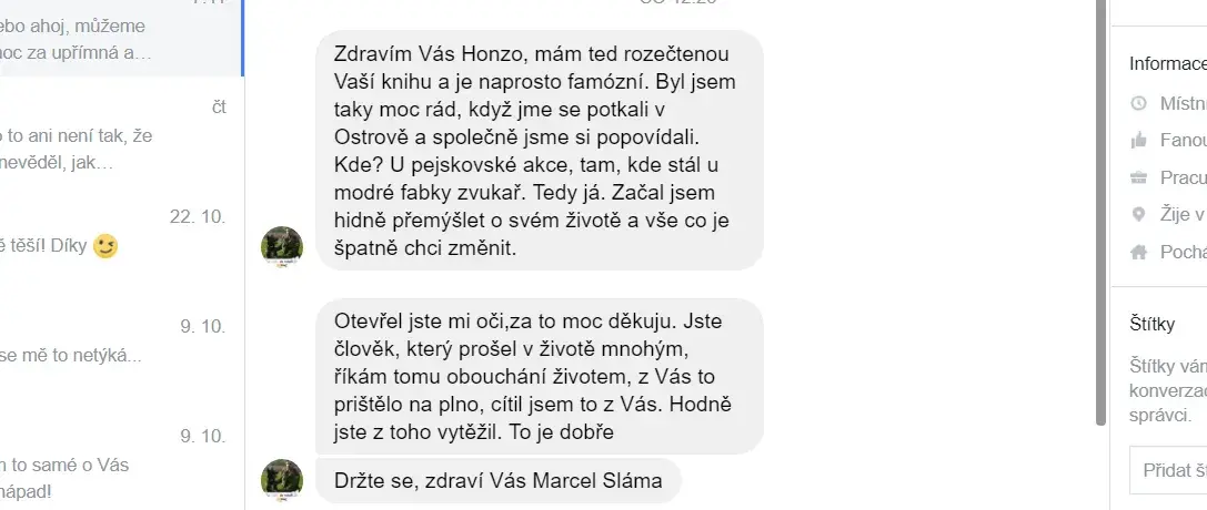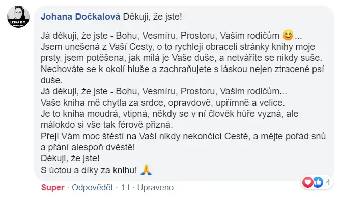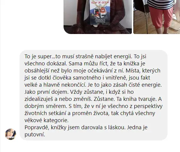 Janička To je super… to musí strašně nabíjet energií. To jsi všechno dokázal. Sama můžu říct, že ta knížka je obsáhlejší, než bylo moje očekávání z ní. Místa, kterých jsi se dotkl člověka samotného i vnitřně, jsou fakt velké a hlavně nekončící. Je to jako zásah čisté energie. Jako první dojem. Vždy zůstane, i když si ho zidealizuješ a nebo změníš. Zůstane. Ta kniha tvaruje. A dobrým směrem. S tím, že v ní je všechno z perspektivy životních setkání a proměn života, tak chytá všechny věkové kategorie. Popravdě, knížky jsem darovala s láskou. Jedna je putovní.